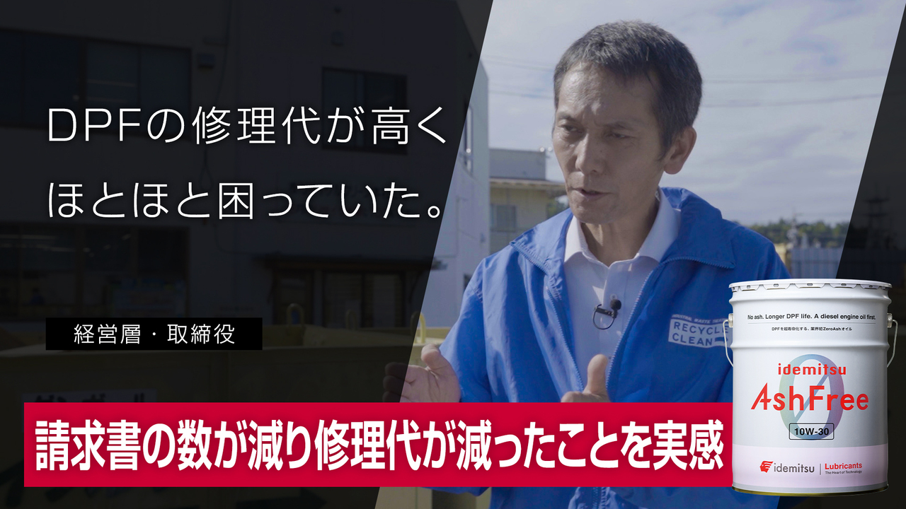 idemitsu AshFreeをご使用されたお客様にインタビューを行いました。 「DPFの修理代が高く、請求書がくるたびに、またか・・・と頭を抱えていました。AshFreeを試してみたところ、高額な請求書が来なくなり、修理代が減ったことを実感しました。」等のコメントを頂きました。