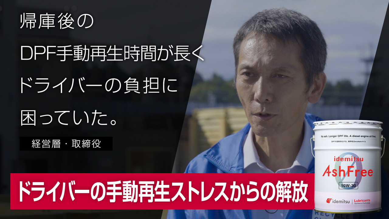 idemitsu AshFreeをご使用されたお客様にインタビューを行いました。 「パッカー車は、走行と収集作業の繰り返しで、DPFの手動再生の機会がありません。帰庫後の再生で夜遅くまで待機することは、ドライバーにとってものすごいストレスでした。AshFreeを入れてからは、手動再生の回数も待ち時間も減りました。」等のコメントを頂きました。