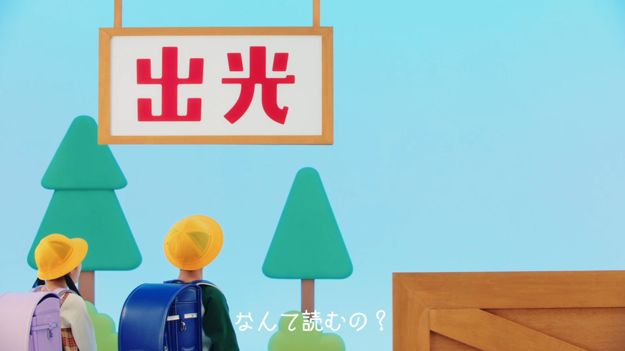 小学生たちが見上げる「出光」の看板。パペットがその読み方をめぐって大騒ぎします。「しゅっこう?」「でびかり?」などの読み間違いをしたり、得意げに説明しようとするパペットの姿や、最後に「なるほど、そう読むのか!」と気づき、「出光にこうさん(降参)」してしまうユーモアのある展開をご覧ください。